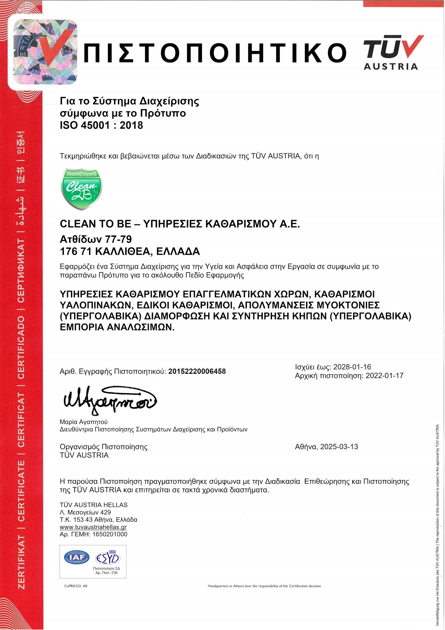 Η διασφάλιση συνθηκών Υγείας και Ασφάλειας στους χώρους εργασίας αποτελεί βασική προτεραιότητα και δέσμευση της Clean2B.