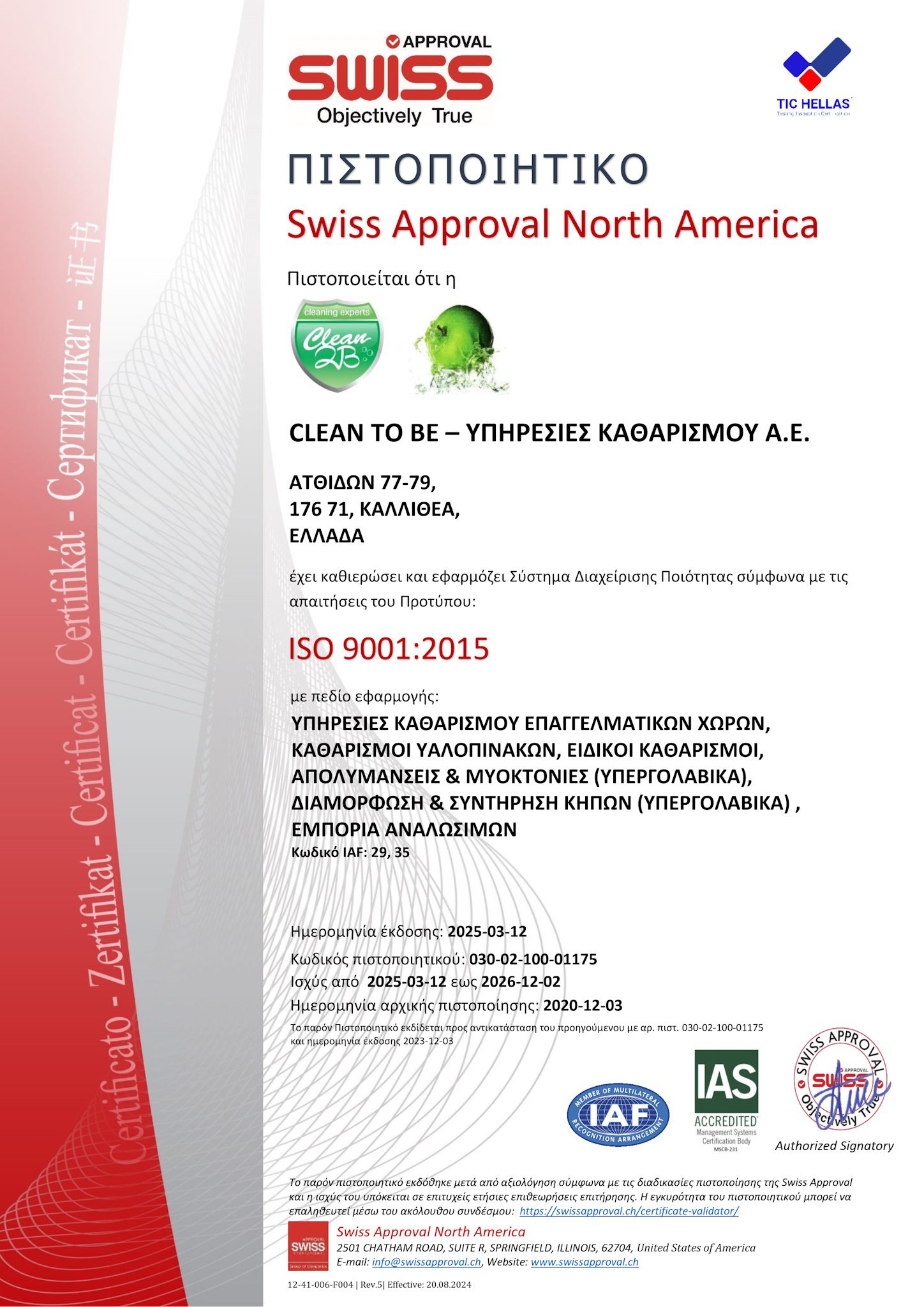 Στην Clean2B, έχοντας το know-how, μέσα από την εμπειρία μας στον χώρο της Παροχής Υπηρεσιών καθαρισμού κτιρίων, έχουμε υιοθετήσει "Σύστημα Διαχείρισης της Ποιότητας" σύμφωνα με το Διεθνές Πρότυπο ISO 9001:2015.